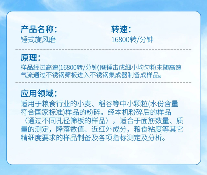 只有打好樣品前處理這一 “地基”,才能在食品安全檢測中交出真實、精準的答卷 —— 錘式旋風磨用機械研磨的精密性,為每一份檢測數據筑牢可信度根基,讓 “大國糧倉” 的質檢防線從樣本研磨環節就充滿技術底氣,最終以可靠的檢測報告守護舌尖上的安全,為嚴苛的食品安全標準落地提供無可辯駁的技術支撐。
