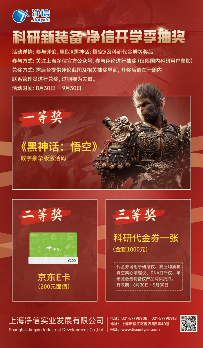 親愛的科研伙伴們,新學(xué)期伊始,是不是感覺你的實(shí)驗(yàn)室還缺點(diǎn)什么?上海凈信來幫你補(bǔ)齊裝備!參與我們的開學(xué)季抽獎(jiǎng)活動(dòng),就有機(jī)會(huì)獲得《黑神話:悟空》數(shù)字豪華版激活碼,讓你的科研生活不再單調(diào)。不僅如此,還有京東E卡科研代金券等你來拿,讓你的科研之路更加順暢!