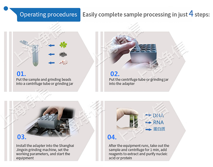 Shanghai Jingxin?'s JXFSTPRP-CLN? cryogenic tissue grinder (patented product, counterfeiting must be punished! ZL2017305264903) is a special, fast, efficient, multi-tube consistent system. It can extract and purify the original DNA, RNA and protein from any source (including soil, plant and animal tissues/organs, bacteria, yeast, fungi, spores, paleontological specimens, etc.).