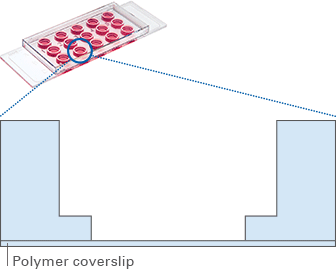 The μ-Slide 15 Well 3D can also be used as a low-volume microscopy chamber without any gel, which is useful for experiments where several wells with a low volume are required.