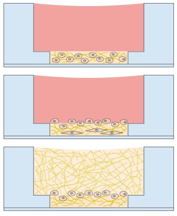 After the gel has been pipetted into the inner well and given time to solidify, the cells can be seeded on top of it for tube formation analysis. Due to the “well-in-a-well” technology, the amount of gel needed is reduced to only 10 μl per well, which is 10% of the amount used in regular multiwell plates.