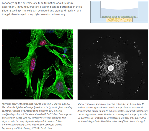 For analyzing the outcome of a tube formation or a 3D culture experiment, immunofluorescence staining can be performed in the μ-Slide 15 Well 3D. The cells can be fixated and stained directly on or in the gel, then imaged using high-resolution microscopy.