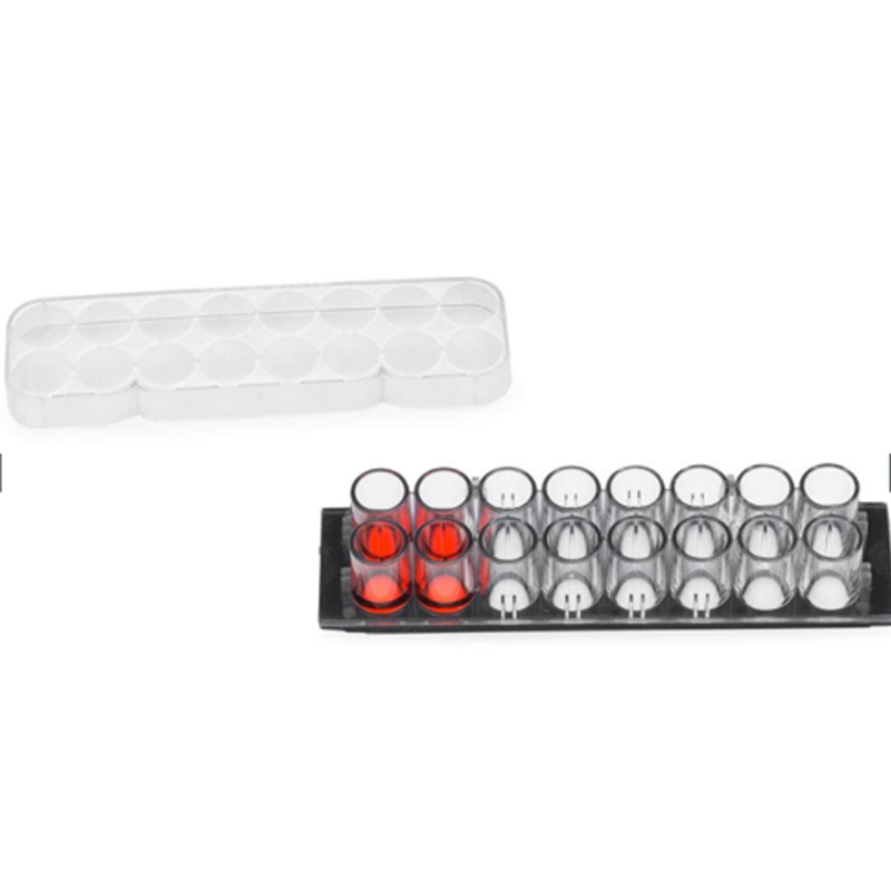 蓋玻片上的腔室共16個,分2排,各8孔(如圖示),每孔的內(nèi)直徑6mm。設(shè)計的每孔體積和孔距與標(biāo)準(zhǔn)96孔板的相同,無細(xì)胞毒性的硅膠孔墊片(silicone well gasket)與上層聚苯乙烯材料的腔室(the upper structure,厚0.5mm)和基層的硼硅酸鹽蓋玻片(the substructure,厚0.16-.19mm)形成滴水不漏的密封。有上層腔室時每孔體積250μl,去掉上層腔室后每孔體積9μl。