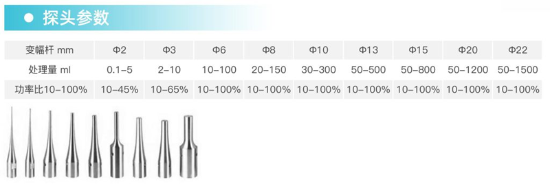 超聲探頭采用美標TC4材質的高純鈦合金,探頭形狀:錐形、鞭節(jié)形,發(fā)波形式:垂直超聲