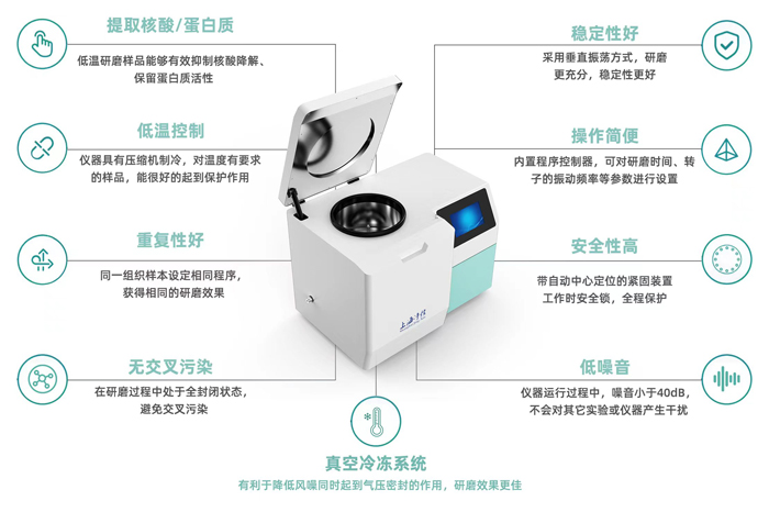 產品簡介:真空冷凍研磨儀常用真空系統,靜音高效,冷凍功能(-50℃~室溫可調) 保留樣本活性。